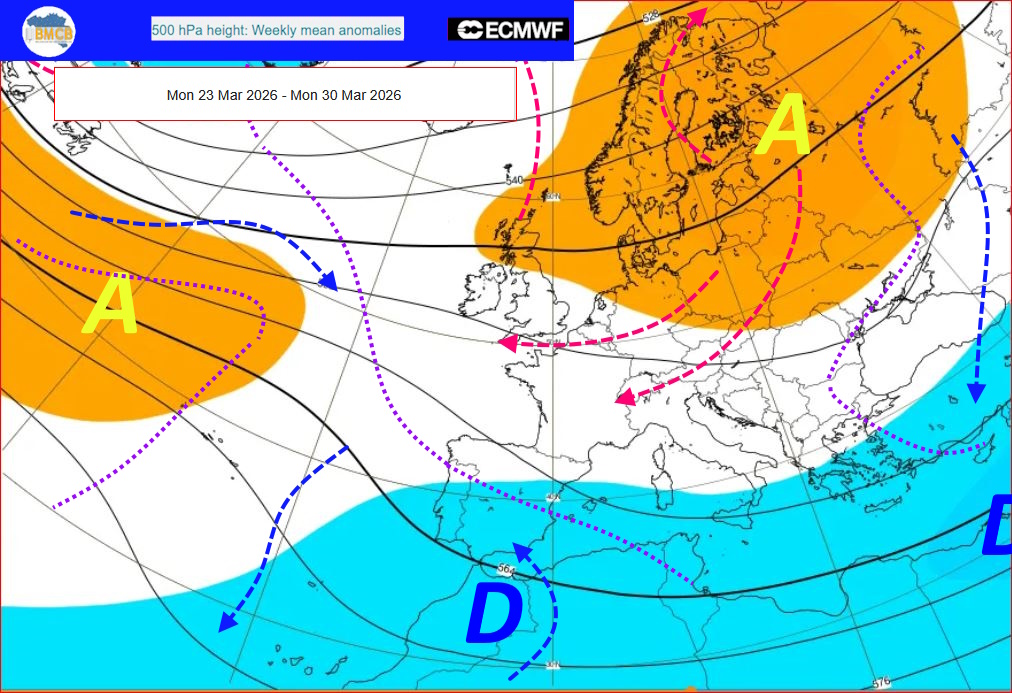 At a later stage, this high-pressure area is expected to shift gradually westwards, extending from Scandinavia across the North Sea towards the British Isles. Such an evolution would favour a prevailing north-easterly flow over our areas, while maintaining stable and dry weather. Temperatures would generally remain above seasonal averages, confirming a persistently settled and mild end to March.