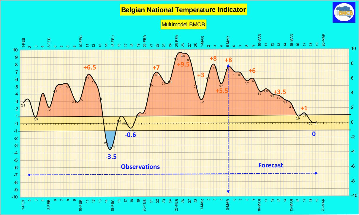 Over the coming days, the national thermal index is expected to remain mostly between +6 and +7, confirming the persistence of markedly milder-than-average conditions for early March.