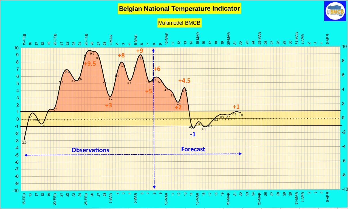 The national thermal indicator is expected to gradually decline over the coming days, reaching values between +4 and +1 by 12 March.