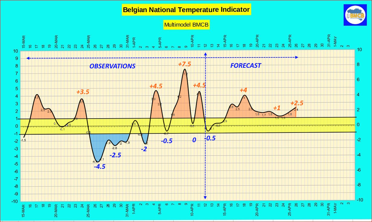 A milder spell is nevertheless likely between 15 and 21 April. The thermal index could temporarily rise to between +2 and +4, corresponding to daytime temperatures between 15 and 22°C over Belgium.