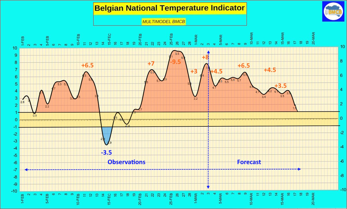 In de komende dagen zal de nationale thermische index meestal schommelen tussen +4 en +7, wat wijst op het aanhouden van een duidelijk zachter dan normaal weertype voor begin maart.