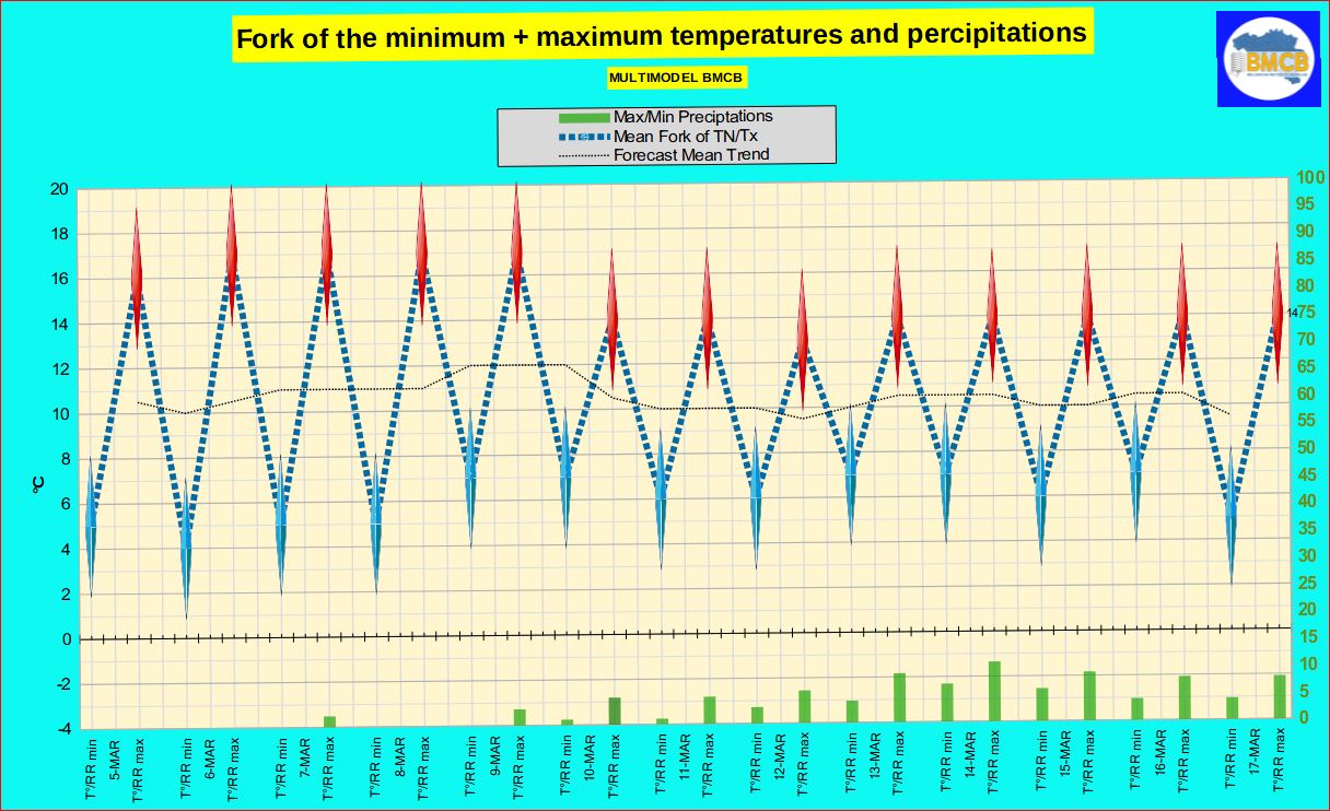 Vanaf 10 maart wordt een lichte daling verwacht: de thermische index zou terugvallen naar waarden tussen +3 en +5. Dit vertaalt zich in gematigder dagtemperaturen, doorgaans tussen 10 en 17 °C, maar nog steeds ruim boven de klimatologische gemiddelden.