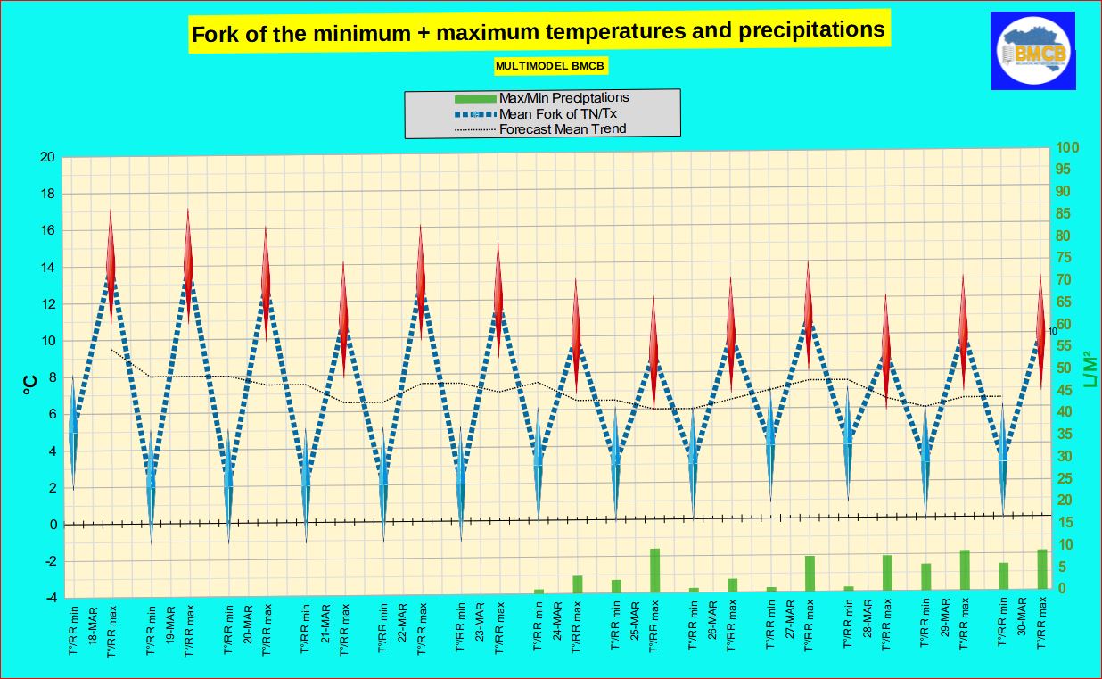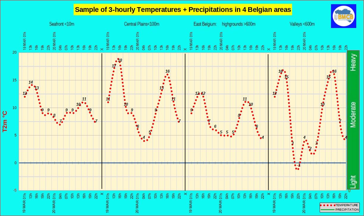 In deze thermische context kunnen vanaf 19 maart plaatselijk lichte nachtvorsten optreden, soms wat uitgesprokener in de valleien van het zuidoosten van het land.