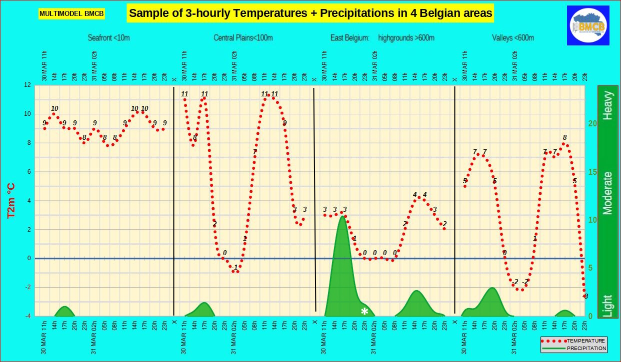 Volgens het BMCB-multimodel wordt de periode eind maart en begin april gekenmerkt door een opeenvolging van zwakke tot matige storingen in een aanvankelijk frisse en vaak bewolkte atmosfeer. Tussen 31 maart en 3 april trekken geregeld enkele regen- of buienzones over het land, soms vergezeld van een matige zuidwestenwind, terwijl de neerslaghoeveelheden doorgaans beperkt blijven.