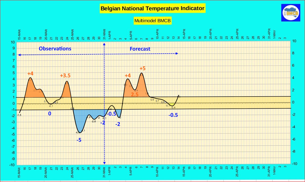 Vanaf 4 april tekent zich geleidelijk een zachtere evolutie af. De thermische index stijgt naar waarden tussen +1 en +5, wat wijst op de geleidelijke aanvoer van mildere lucht. 🌤️