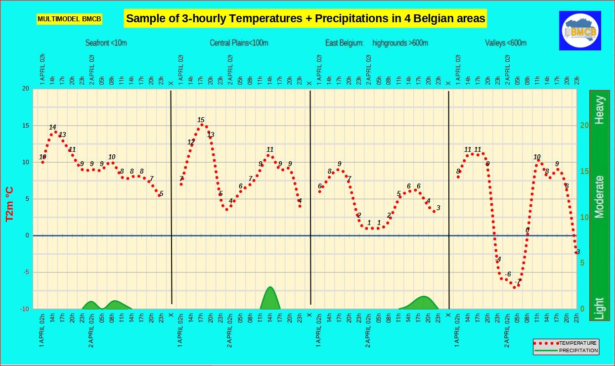 Tot 3 april blijft de nationale thermische index in België licht negatief, tussen -3 en 0. In deze context blijven de dagtemperaturen relatief fris voor de tijd van het jaar, met maxima doorgaans tussen 7 en 14°C afhankelijk van de regio. Lichte vorst blijft lokaal mogelijk in het laagland (0 tot -2°C), terwijl deze in de valleien ten zuiden van de Samber-Maas-as duidelijker kan zijn, met minima tussen -2 en -7°C.