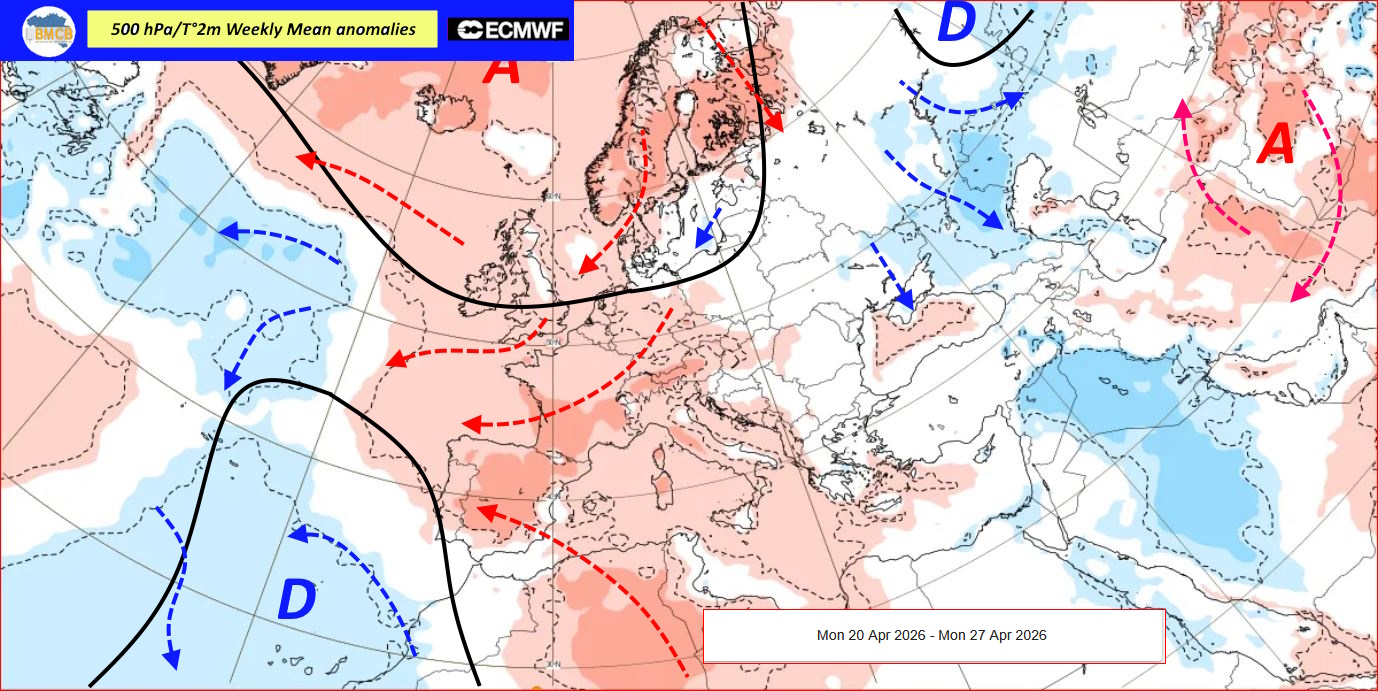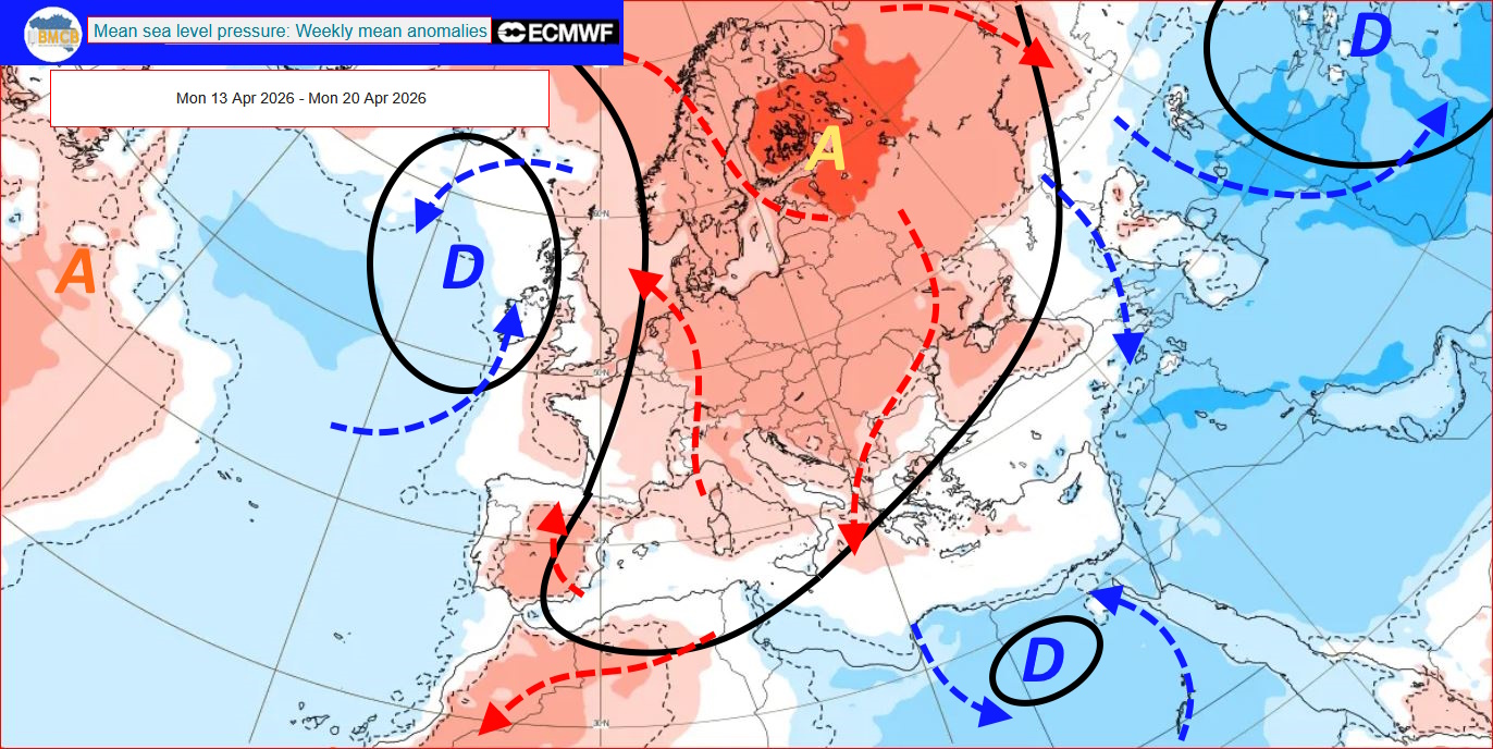 De laatste middellange termijnprojecties wijzen op de geleidelijke opbouw van een omvangrijk hogedrukblok tussen de poolgebieden, Centraal-Europa en het westen van het Middellandse Zeegebied tijdens de week van 13 tot 20 april. Tegelijkertijd zouden lagedrukzones zich ontwikkelen boven het noorden van Egypte en ten westen van de Britse eilanden.