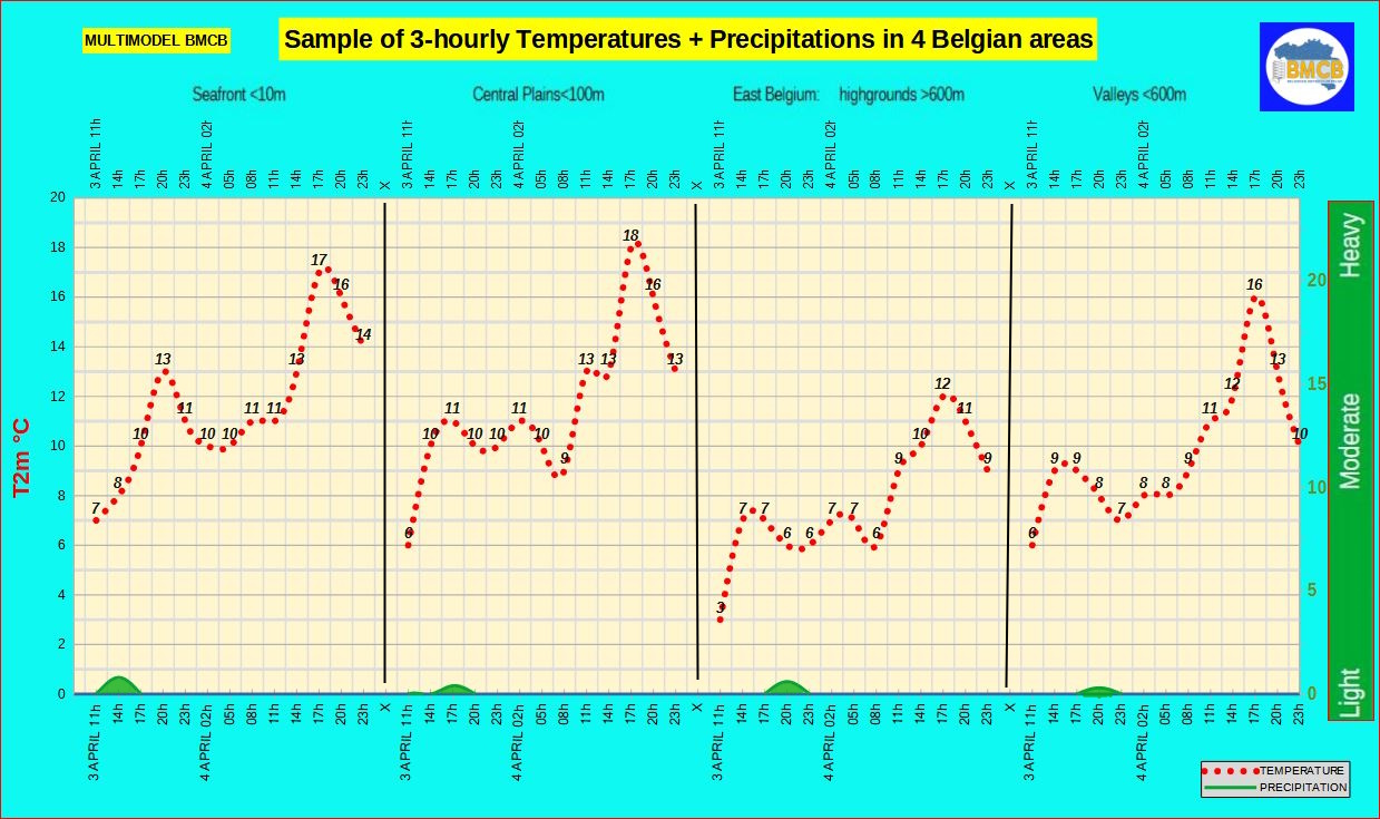 In de namiddag valt opnieuw plaatselijk lichte regen, vooral in Vlaanderen en het westen van Henegouwen, later richting het centrum. Maxima rond 13°C aan zee, 10 tot 12°C in het binnenland en 7 tot 9°C in de Hoge Ardennen bij een matige zuid- tot zuidwestenwind.