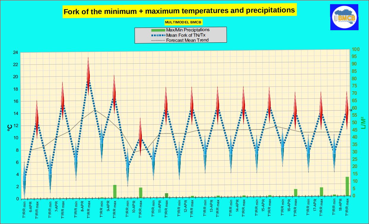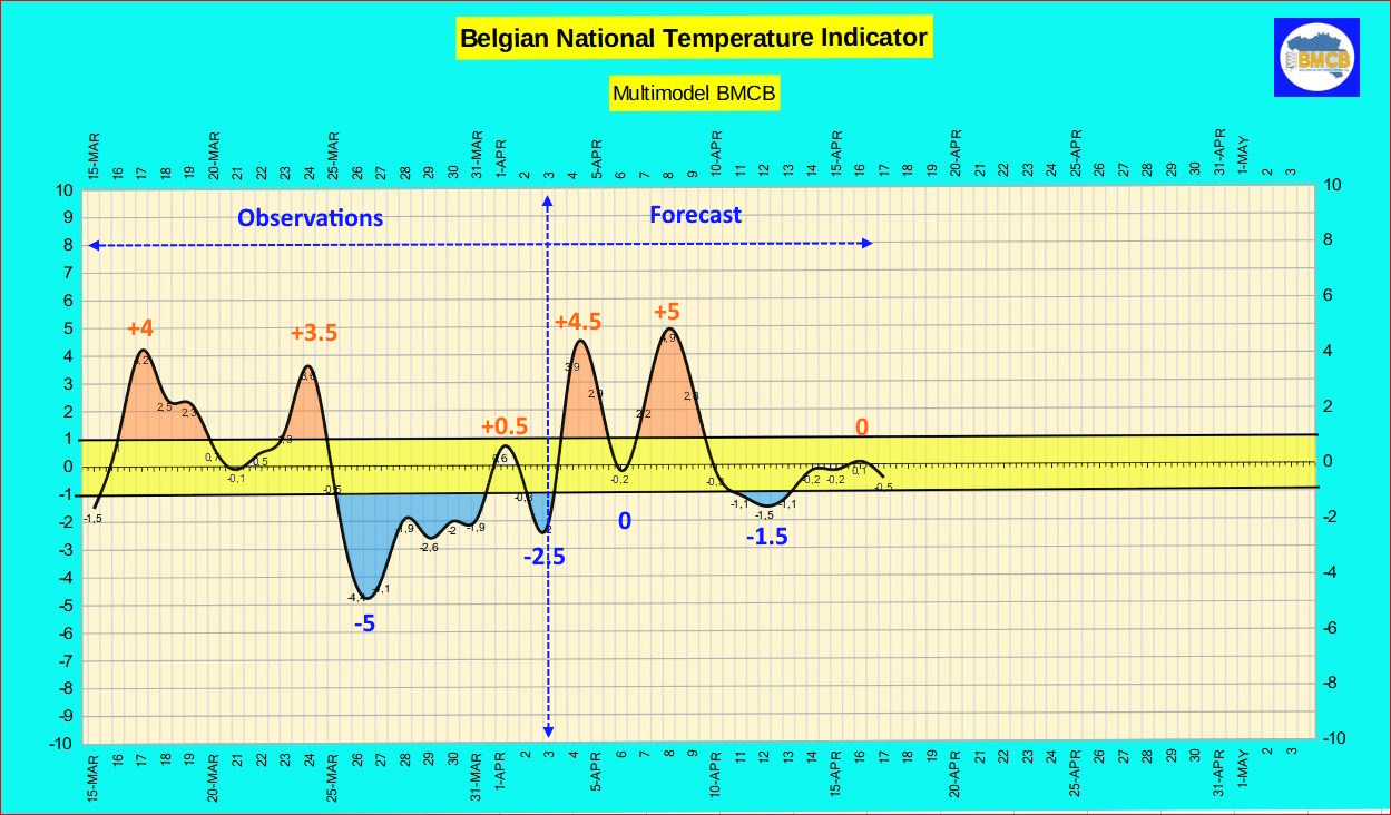 Na 9 april wijst de trend op een geleidelijke terugkeer naar temperaturen rond of licht onder de seizoensnormen. De maxima liggen dan eerst tussen 7 en 14°C, gevolgd door een lichte stijging naar 10 tot 16°C na 13 april.