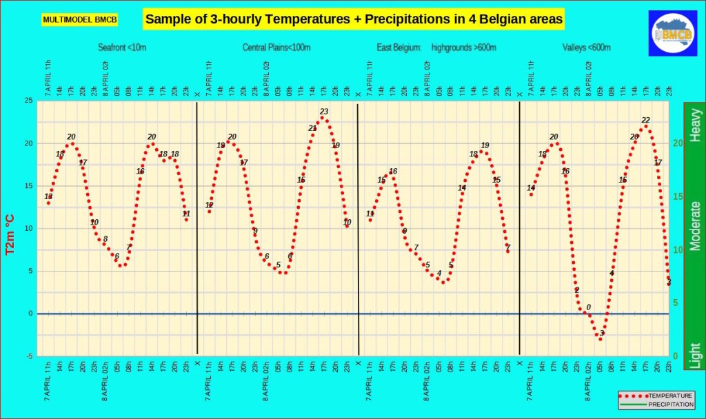 De oostenwind blijft zwak tot matig en lokaal veranderlijk ten zuiden van Samber en Maas. De maxima bereiken ongeveer 20°C aan zee, 19 tot 20°C in het binnenland en 16 tot 20°C in de Hoge Ardennen.